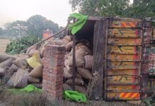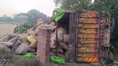 अनियंत्रित होकर पलटा ट्रक,खेत में बिखरे गेहूं के बोरे