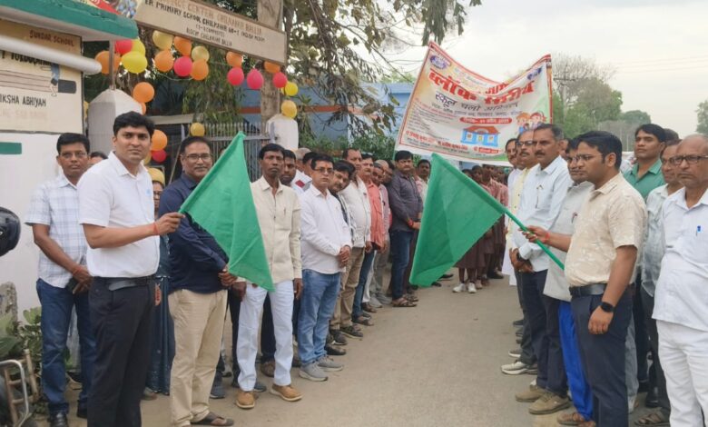 रसड़ा (बलिया)।’स्कूल चलो अभियान’ के प्रथम चरण में बीआरसी चिलकहर से बच्चों की रैली निकाली गई। चिलकहर के खंड विकास अधिकारी विनोद कुमार बिंद एवं खंड शिक्षा अधिकारी हिमांशु सिंह ने संयुक्त रूप से हरी झंडी दिखाकर रैली को रवाना किया। रैली में 1200 बच्चों के साथ हाथों में रंग बिरंगे शिक्षा के महत्व को प्रदर्शित करती तख्तियां, ध्वनी विस्तारक यंत्रों से बच्चों को दी जाने वाली सुविधाओं की जानकारी, शिक्षा है अनमोल रतन-पढने की सब करो जतन आदि नारे लगाते हुए नवीन नामांकन के लिए बच्चों अभिभावकों, ग्रामीणों के मध्य भ्रमण किया।बीईओ ने बताया कि इस वर्ष 3 साल के बच्चों को बाल वाटिका से जोड़ने और सरकारी स्कूलों में शत-प्रतिशत नामांकन (0 ड्राप आउट) पर विशेष जोर दिया जा रहा है। बीडीओ ने बताया कि यह अभियान विकसित उत्तर प्रदेश के लक्ष्य के तहत चलाया जा रहा है ताकि कोई भी बच्चा शिक्षा से वंचित न रहे।पहली बार 3-5 वर्ष के नन्हें बच्चों को बाल वाटिका के माध्यम से स्कूल से जोड़ा जा रहा है।ग्रामीणों ने भी सकारात्मक सहयोग देकर इस अभियान के अंतर्गत बच्चों का नामांकन सरकारी विद्यालय में कराने के लिए सहमति दी है।इस दौरान बच्चों में नवीन पुस्तक वितरण कार्यक्रम के बाद खंड शिक्षा अधिकारी ने सभी का आभार जताते हुए शत् प्रतिशत नामांकन के लिए प्रेरित किया।कार्यक्रम में एआरपी अखिलेश सिंह, निरंजन कुमार, हेमंत कुमार, बलवंत सिंह, पवन सिंह, अभिषेक सिंह, अनिल सिंह, सत्यजीत सिंह, सुरेश आजाद, सतीश सिंह, शिवजन्म यादव, दिग्विजय सिंह, संजय वर्मा, दीनबंधु सिंह, संजय सिंह, धनंजय सिंह, रामप्रकाश तिवारी, जयमंगल यादव, विनोद गुप्त, विनय कुमार बिसेन, विश्वामित्र वर्मा, सुनील वर्मा, रिंकी सिंह, संतोष सिंह, जयंत सिंह, गौरव गुप्त, राकेश कुमार आदि रहे। संचालन प्राशिसं के अध्यक्ष अरुण कुमार पांडेय ने किया।