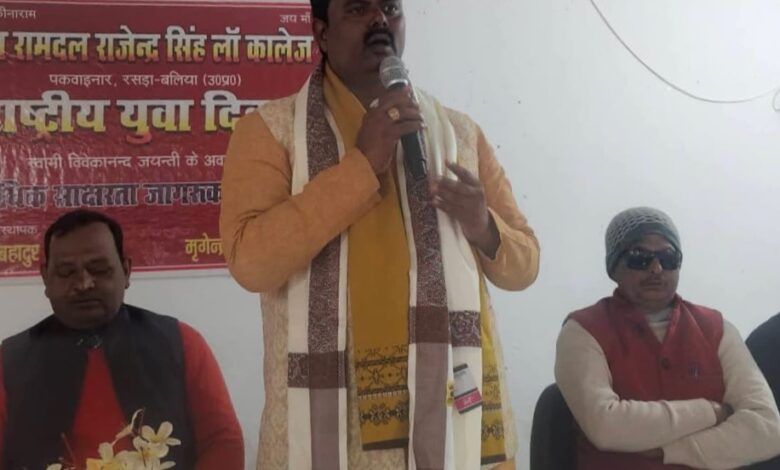 रसड़ा (बलिया)। बाबा रामदल राजेंद्र सिंह विधि महाविद्यालय पकवाइनार में मंगलवार को राष्ट्रीय युवा दिवस के अवसर पर संगोष्ठी का आयोजन किया गया। कार्यक्रम के मुख्य अतिथि बाबा रामदल सूरजदेव ग्रुप ऑफ कॉलेज के व्यवस्थापक शिवेंद्र बहादुर सिंह ने दीप प्रज्ज्वलित कर कार्यक्रम का शुभारंभ किया। उन्होंने स्वामी विवेकानंद के जीवन, विचारों एवं राष्ट्र निर्माण में युवाओं की भूमिका पर विस्तार से प्रकाश डालते हुए कहा कि स्वामी विवेकानंद का संदेश आज के युवाओं के लिए मार्गदर्शक है, जो आत्मविश्वास, चरित्र निर्माण और सेवा भावना को सुदृढ़ करता है।