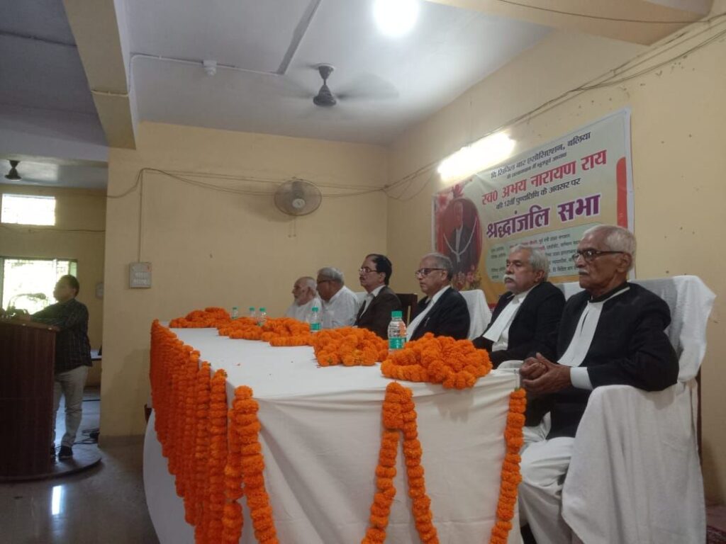 बलिया। दी सिविल बार एसोसिएशन बलिया के तत्वावधान में शुक्रवार की शाम पूर्व अध्यक्ष स्वर्गीय अभय नारायण राय की 12वीं पुण्य तिथि के अवसर पर श्रद्धांजलि सभा सिविल बार एसोसिएशन के सभागार में आयोजित किया गया। इस दौरान मुख्य अतिथि पूर्व मंत्री अंबिका चौधरी, विशिष्ट अतिथि अरुण कुमार त्रिपाठी एडवोकेट वर्तमान सदस्य राज्य विधिक परिषद उत्तर प्रदेश इलाहाबाद एवं पूर्व अध्यक्ष, विशिष्ट अनिल कुमार झा जनपद न्यायाधीश बलिया व नरेंद्र कुमार दुबे अध्यक्ष दी सिविल बार एसोसिएशन बलिया ने संयुक्त रूप से स्व राय के चित्र पर पुष्प अर्पित एवं दीप प्रज्ज्वलित कर नमन किया। तत्पश्चात वक्ताओं ने स्व श्री राय के व्यक्तित्व व कृतित्व पर प्रकाश डाला।