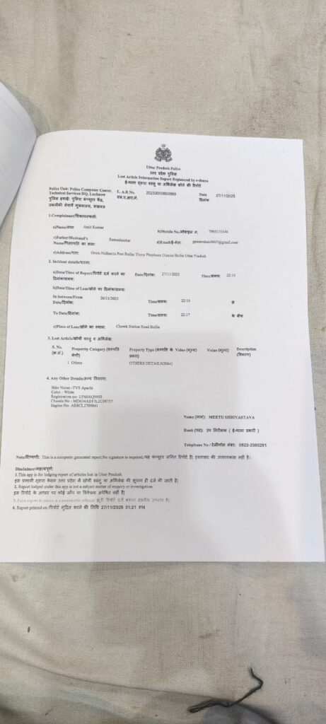 बलिया। नगर के चौक- स्टेशन रोड से बुधवार को एक कपड़ा दुकानदार की बाइक चोरी हो गई। शहर से सटे निधरिया गांव निवासी रमाशंकर की चौक में होजरी कपड़े की दुकान है। बुधवार को उनके पुत्र अमित कुमार ने अपनी सफेद रंग की टीवीएस अपाची बाइक (यूपी 60 एक्यू 9903) दुकान से कुछ दूरी पर गली में खड़ी की थी। रात में दुकान बंद करके घर आने के लिए गली में गए तो बाइक गायब थी। अमित की शिकायत पर पुलिस ने रिपोर्ट दर्ज करके जांच शुरू कर दी है।