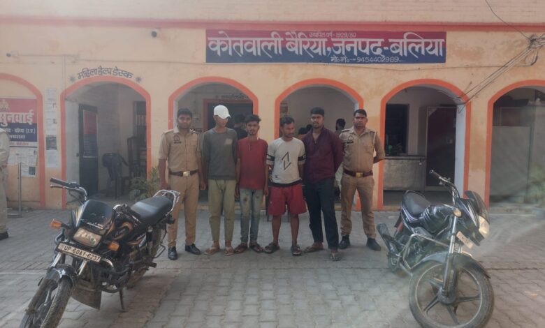 दयाछपरा(बलिया)। पुलिस ने कई स्थानों से चोरी किए गए दो मोटरसाइकिलों के साथ चार आरोपियों को दयाछपरा चिंतामणि राय के टोला मार्ग से शुक्रवार की देर शाम गिरफ्तार कर उनके पास से चोरी की दो हीरो स्प्लेंडर मोटरसाइकिल एक 315 बोर का तमंचा व एक जिंदा कारतूस बरामद करने में सफलता प्राप्त की है। प्रभारी निरीक्षक बैरिया राजेंद्र प्रताप सिंह ने बताया कि मुखबिर से सूचना मिली थी कि चार लोग दो चोरी की बाइक लेकर बलिया की तरफ से बैरिया आ रहे हैं। सूचना के बाद चौकी इंचार्ज बैरिया अजय कुमार, उप निरीक्षक प्रदीप कुमार व उप निरीक्षक नीरज वर्मा भारी पुलिस बल के साथ चारों आरोपियों की घेराबंदी करके हिरासत में ले लिया। पूछताछ करने पर आरोपियों ने स्वीकार किया कि दोनों मोटरसाइकिल हम लोग चोरी किये है।एक मोटरसाइकिल बांसडीह रोड थाना के छितौनी शिव मंदिर से और दूसरा हल्दी क्षेत्र से चोरी की गई है। उनकी तलाशी लेने पर एक आरोपी के कमर में 315 बोर का कट्टा और एक जिंदा कारतूस भी मिला। पुलिस ने इस मामले में चारों आरोपी को गिरफ्तार किया गया। गिरफ्तार आरोपियों में विक्की कुमार गुप्त निवासी कारनामेपुर जिला भोजपुर बिहार, विकास कुमार पुत्र किशुन यादव निवासी कारनामे पुर भोजपुर बिहार, अंतराज सिंह निवासी ईश्वरपुरा थाना कारनामेपुर बिहार व विकास कुमार यादव पुत्र नंद जी यादव निवासी कारनामेपुर भोजपुर बिहार शामिल है। पुलिस ने चारों आरोपियों को सुसंगत धाराओं में मुकदमा दर्ज करते हुए न्यायालय को सुपुर्द कर दिया है।